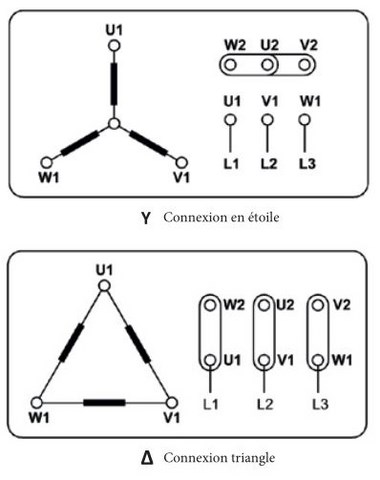 Les moteurs doivent être connectés en étoile ou en triangle en fonction de la tension nominale indiquée sur leur plaque signalétique et de la tension de réseau à laquelle ils seront connectés.