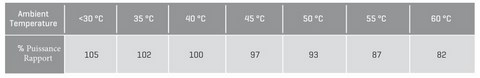 Les moteurs ELK sont conçus pour fonctionner à une température ambiante allant jusqu'à 40°C, conformément à la norme CEI 60034-1. La puissance nominale varie en fonction des pourcentages indiqués ci-dessous pour différentes températures ambiantes.