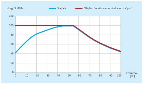 Si le moteur doit être entraîné dans une plage plus large, un ventilateur entraîné séparément est nécessaire. En utilisant un ventilateur à entraînement séparé, les moteurs peuvent être entraînés dans la gamme defini par la ligne rouge.
