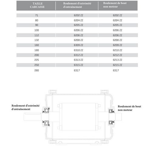 Les moteurs ELK standard sont équipés de roulements à billes avec des boucliers ZZ comme indiqué ci-dessous, en fonction de la taille du châssis. Les roulements NU-NJ sont optionnels.