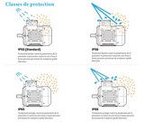L'entrée de la poussière n'est pas totalement empêchée, mais la poussière ne pénètre pas en quantité suffisante pour nuire au bon fonctionnement du moteur. L'eau provenant de grosses eaux ou l'eau projetée par de puissants jets ne pénètre pas dans le moteur en quantité nuisible.