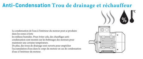 Pour éviter cela, des chauffages sont montés à l'intérieur du moteur pour maintenir la température des enroulements stable. Des trous d'évacuation sont également ouverts pour empêcher l'accumulation d'eau à l'intérieur du moteur.
